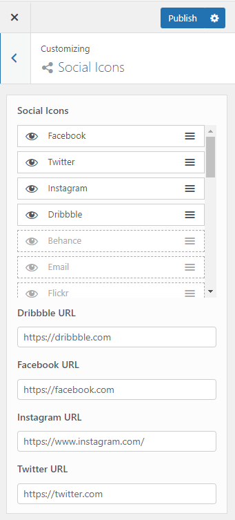 Social icons link your visitors to your chosen social media accounts. To set up your social icons, navigate to **Appearance** → **Customizing** → **Social Icons**.